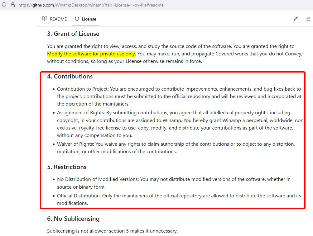 Μαντέψτε τι; Η άδεια της Winamp παραβίασεΌροι υπηρεσιών του GitHub, η οποία λέει: "Ρυθμίζοντας τα αποθετήρια σας που πρέπει να προβληθούν δημοσίως, συμφωνείτε να επιτρέψετε σε άλλους να δουν και να" πιέσουν "τα αποθετήρια σας (αυτό σημαίνει ότι άλλοι μπορούν να κάνουν τα δικά τους αντίγραφα περιεχομένου από τα αποθετήρια σας σε αποθετήρια που ελέγχουν)." Υπάρχει ανοιχτόσυζήτησηΣχετικά με αυτό στο Github του Winamp.