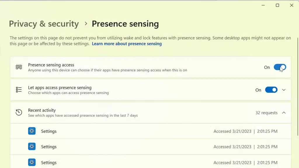 Οι χρήστες θα μπορούν να ελέγχουν ποιες εφαρμογές αισθανθούν την παρουσία τους στην περιοχή ρυθμίσεων απορρήτου στα παράθυραΡυθμίσειςεφαρμογή, η οποία είναι προσβάσιμη στοΡυθμίσεις>Ιδιωτικότητα και ασφάλεια>Ανίχνευση παρουσίας. Από εδώ, οι χρήστες μπορούν να αλλάξουν ποιες εφαρμογές έχουν πρόσβαση μεμονωμένα ή απενεργοποιούν τη λειτουργία εξ ολοκλήρου.