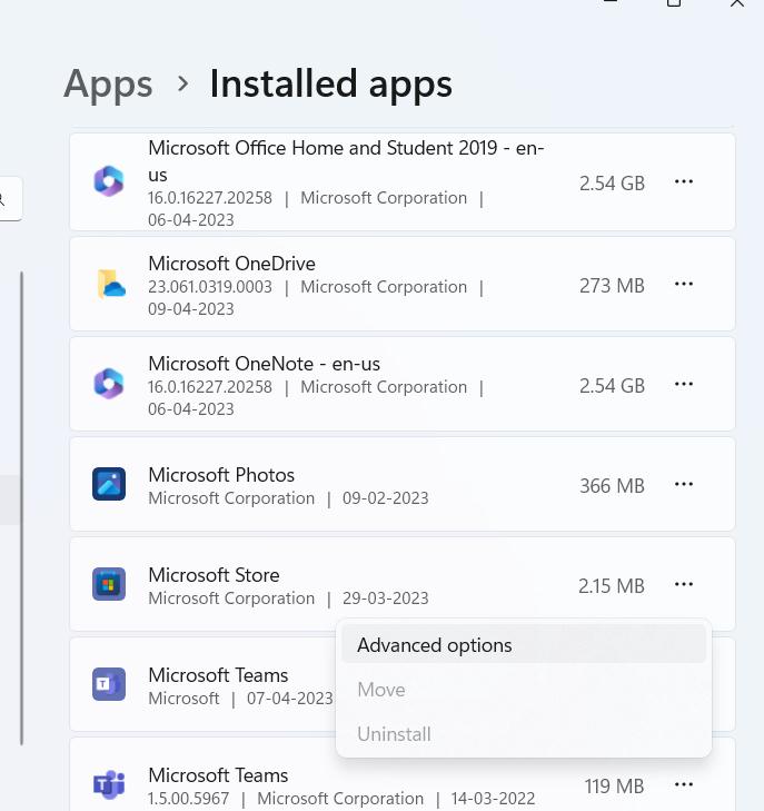 - Μετακινηθείτε προς τα κάτω, εντοπίστεΚατάστημα Microsoft, κάντε κλικ στις τρεις οριζόντιες κουκίδες και κάντε κλικ στο κουμπίΠροχωρημένες επιλογές.