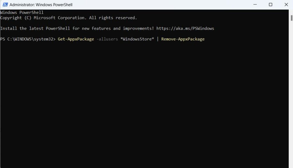 Το σφάλμα 0x87E00017 μπορεί να υποδηλώνει ότι υπάρχει κάτι λάθος με την εφαρμογή Windows Store στον υπολογιστή σας. Το καλύτερο στοίχημα εδώ είναι να απεγκαταστήσετε και στη συνέχεια να επανεγκαταστήσετε την εφαρμογή Microsoft Store. Αυτό μπορεί να γίνει μέσω των Windows PowerShell (admin) -