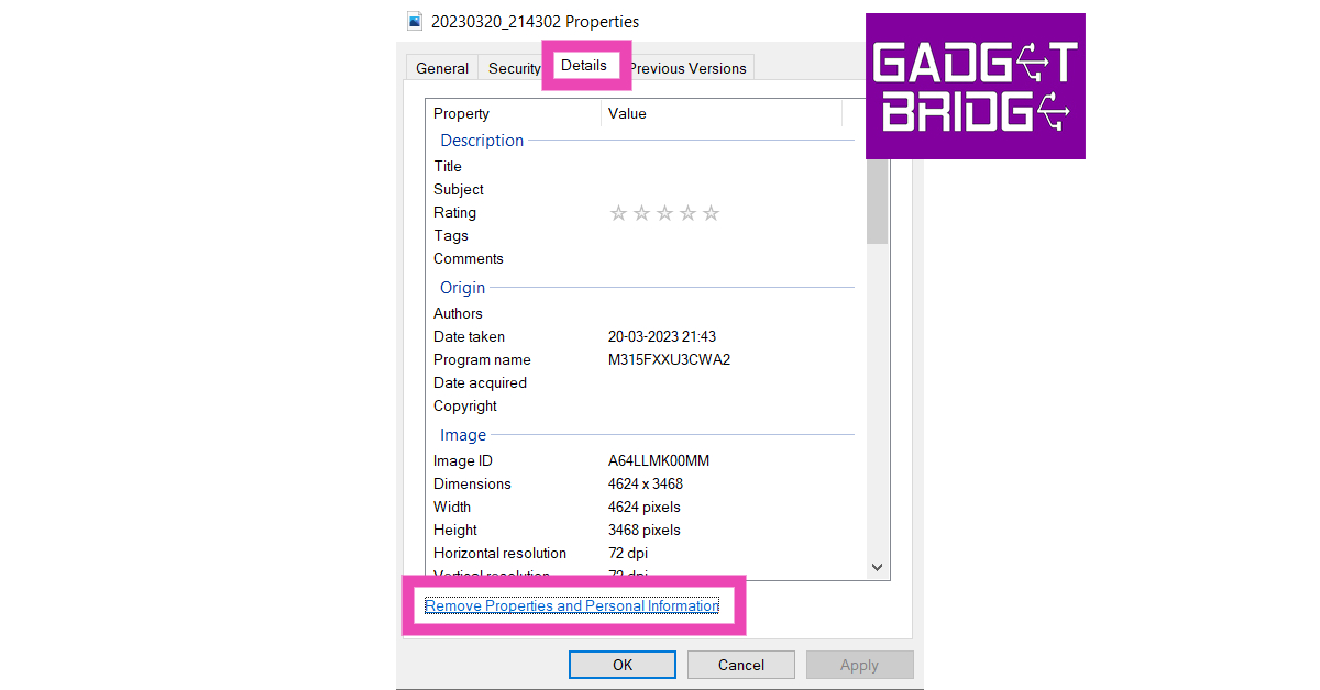 Βήμα 3:Μεταβείτε στην καρτέλα Λεπτομέρειες και κάντε κλικ στο "Αφαιρέστε τις ιδιότητες και τις προσωπικές πληροφορίες" στο κάτω μέρος του πλαισίου.