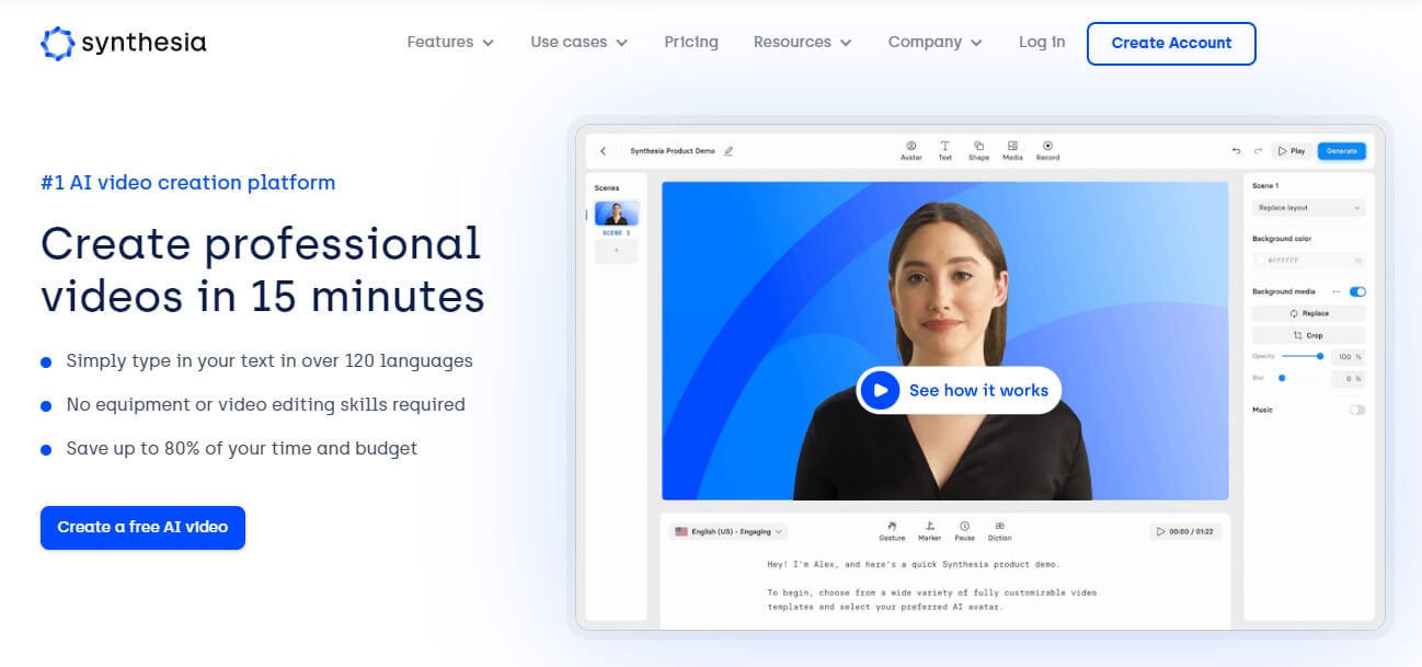 ΜεSynthesia, δεν χρειάζεται πλέον να περάσετε ώρες για την παραγωγή βίντεο ή να προσλάβετε ακριβές ομάδες παραγωγής βίντεο. Με την τεχνητή νοημοσύνη, η Synthesia μπορεί εύκολα να μετατρέψει οποιοδήποτε κομμάτι κειμένου σε ένα υψηλής ποιότητας, συναρπαστικό βίντεο σε λίγα λεπτά.