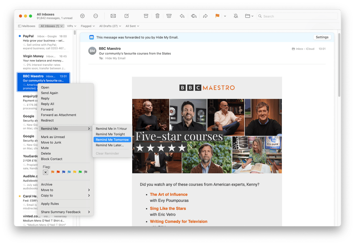 Το Apple Mail διαθέτει ένα χαρακτηριστικό που σας επιτρέπει να σας υπενθυμίσουμε σημαντικά μηνύματα ηλεκτρονικού ταχυδρομείου αργότερα, όταν είστε σε θέση να είστε σε θέση να απαντήσετε σε αυτά. Άλλες εφαρμογές ηλεκτρονικού ταχυδρομείου έχουν μια παρόμοια λειτουργία, μερικές φορές ονομάζεται Snooze. Για να χρησιμοποιήσετε το Temind Me στο Apple Mail, είτε σύρετε δεξιά με δύο δάχτυλα πάνω από ένα μήνυμα στα εισερχόμενά σας και επιλέξτε μου θυμάστε και επιλέξτε μια περίοδο για την υπενθύμιση ή κάντε δεξί κλικ στο μήνυμα, επιλέξτε να μου θυμάστε και, στη συνέχεια, επιλέξτε την χρονική περίοδο. Θα λάβετε μια ειδοποίηση όταν φτάσει ο χρόνος και το μήνυμα θα εμφανιστεί στην κορυφή των εισερχομένων σας. Χρησιμοποιώντας τη χρήση μου και την επιμέλεια αρχειοθέτησης μηνυμάτων σε φακέλους ή γραμματοκιβώτια, μπορείτε να διατηρήσετε τα εισερχόμενά σας καθαρά, διασφαλίζοντας παράλληλα να μην ξεχάσετε να απαντήσετε σε ένα σημαντικό μήνυμα.