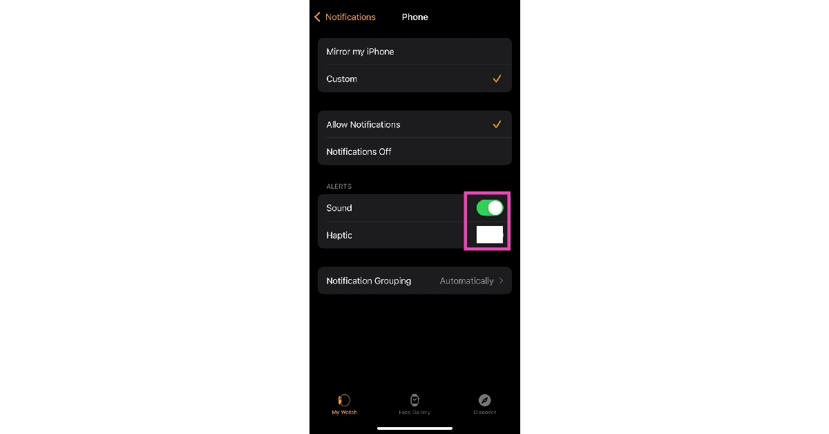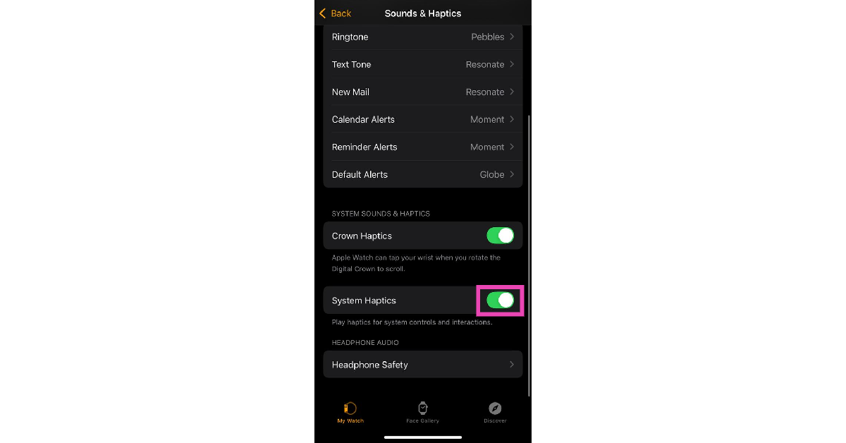 ΠηγαίνωΡυθμίσεις> Ήχος & Hapticsκαι ενεργοποιήστε το διακόπτη εναλλαγής γιαΑπτικές ειδοποιήσειςστο ρολόι της Apple.