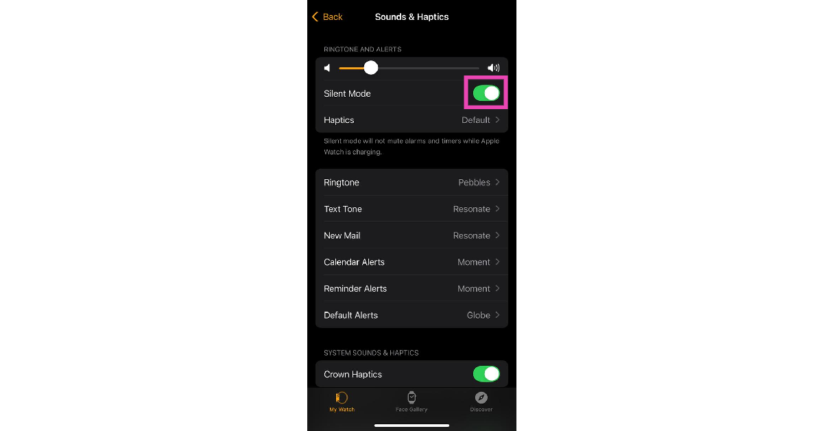 Εάν δεν θέλετε καμία προειδοποίηση ήχου για το Apple Watch σας, μεταβείτεΡυθμίσεις> Ήχος & HapticS και ενεργοποιήστε το διακόπτη εναλλαγής για σιωπηλή λειτουργία. Αυτό δεν θα απενεργοποιήσει τις απτικές ειδοποιήσεις.