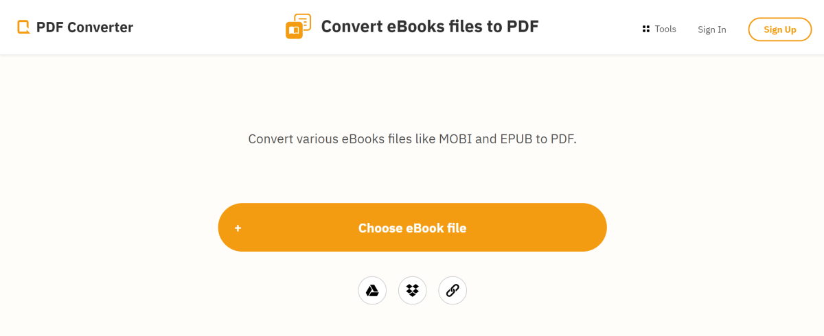 Όπως υποδηλώνει το όνομα,Freepdfconvertείναι ένα ηλεκτρονικό εργαλείο που μετατρέπει δωρεάν τα βιβλία Epub και Mobi σε PDFs. Ένα από τα πλεονεκτήματα της χρήσης αυτού του ιστότοπου είναι ότι σας επιτρέπει να ανεβάσετε αρχεία από το Google Drive και το Dropbox επίσης. Εάν δεν έχετε το αρχείο στον υπολογιστή σας, μπορείτε να αποβάλετε τον σύνδεσμό του και το εργαλείο θα το μετατρέψει αυτόματα για εσάς. Η διεπαφή του ιστότοπου είναι καθαρή, ελάχιστη και εύκολη.