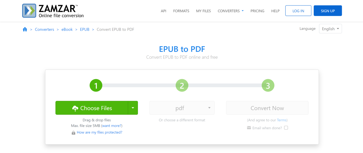 Ζαμζάροςείναι ένα αξιόπιστο εργαλείο μετατροπής στο διαδίκτυο που μπορεί να μετατρέψει δωρεάν το EPUBS σε PDFs. Η διαδικασία μετατροπής είναι πολύ διαισθητική. Το μόνο που χρειάζεται να κάνετε είναι να σύρετε το αρχείο και να το αφήσετε στο πράσινο εικονίδιο που λέει «Επιλέξτε αρχεία». Μπορείτε επίσης να ανεβάσετε το αρχείο με μη αυτόματο τρόπο από τον υπολογιστή σας. Ο Zamzar θα διαβάσει το αρχείο και θα ξεκινήσει αυτόματα τη διαδικασία μετατροπής. Μόλις τελειώσει, θα μπορείτε να κατεβάσετε το αρχείο που μετατρέπεται και να το αποθηκεύσετε στη συσκευή σας. Εάν μετατρέπετε ένα μεγάλο αρχείο, μπορείτε να πάρετε το Zamzar για να σας ειδοποιήσει μέσω ηλεκτρονικού ταχυδρομείου όταν τελειώσει.
