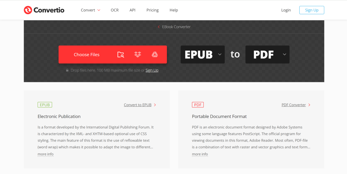 Μετατρέψιμοείναι ένα εργαλείο μετατροπής μη-ανοησίας για eBooks. Δεν χρειάζεται να δημιουργήσετε έναν λογαριασμό στο Convertio για να μετατρέψετε τα eBooks σας από το EPUB σε PDF. Το μόνο αλιευμάτων είναι ότι το μέγεθος του αρχείου δεν πρέπει να υπερβαίνει τα 100MB. Εάν παραβιάσετε το όριο μεγέθους, θα σας ζητηθεί να δημιουργήσετε έναν λογαριασμό για να προχωρήσετε περαιτέρω. Η διάταξη του ιστότοπου είναι πολύ προσβάσιμη και η διαδικασία είναι πολύ εύκολη. Μπορείτε να ανεβάσετε το αρχείο από τον υπολογιστή σας ή να το συνδέσετε χρησιμοποιώντας το Google Drive ή το Dropbox. Τα δύο μενού αναπτυσσόμενα μενού μπορούν να χρησιμοποιηθούν για τον προσδιορισμό των αρχικών και στόχων μορφών για το αρχείο. Ανάλογα με το μέγεθος του αρχείου, θα μπορούσε να διαρκέσει οπουδήποτε μεταξύ 20 δευτερολέπτων έως 2-3 λεπτών για να μετατρέψει τη μορφή του ebook σας.