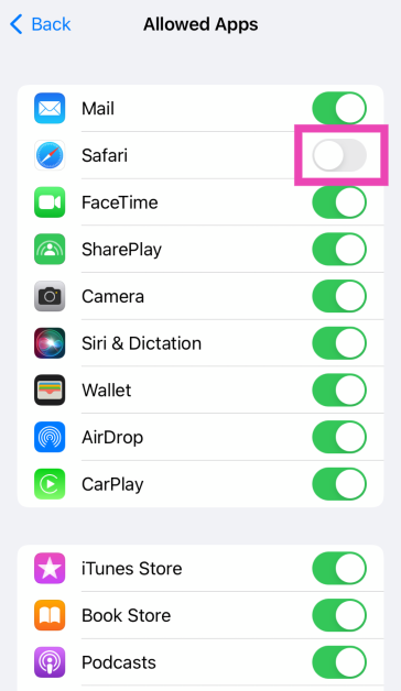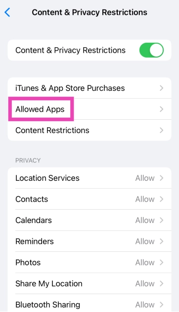 ΠηγαίνωΡυθμίσεις> Περιορισμοί περιεχομένου και ιδιωτικού απορρήτου> Επιτρεπόμενες εφαρμογέςΚαι ενεργοποιήστε το διακόπτη εναλλαγής δίπλα στην εφαρμογή που θέλετε να είστε χωρίς περιορισμούς.