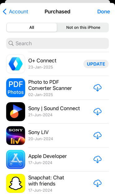 Βήμα 4:Βρείτε την εφαρμογή που προσπαθείτε να ενημερώσετε. Εάν δεν μπορείτε να βρείτε την εφαρμογή στη λίστα, πρέπει να συνδεθείτε χρησιμοποιώντας τοΑναγνωριστικό μήλοότι χρησιμοποιήσατε για να το κατεβάσετε.