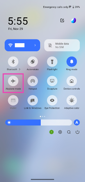 Βήμα 1:Σύρετε προς τα κάτω από τη γραμμή κατάστασης για να αποκαλύψετε τοΜενού γρήγορων ρυθμίσεωνκαι πατήστε στοΛειτουργία αεροπλάνουπλακάκι.