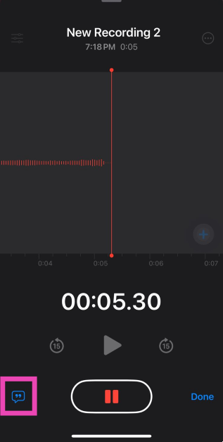 Χτυπήστε το κουμπί εγγραφής στην εφαρμογή Voice Memos, σπρώξτε επάνω στον πίνακα για να το επεκτείνετε και χτυπήστε το εικονίδιο Quotes για να δείτε τη ζωντανή μεταγραφή.