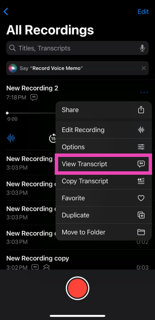 Δημιουργήστε μια εγγραφή ήχου χρησιμοποιώντας την εφαρμογή Voice Memos στο iPhone σας και, στη συνέχεια, επιλέξτε την εγγραφή και πατήστε τις ελλείψεις. Επιλέξτε 'Προβολή μεταγραφής' από τη λίστα επιλογών.