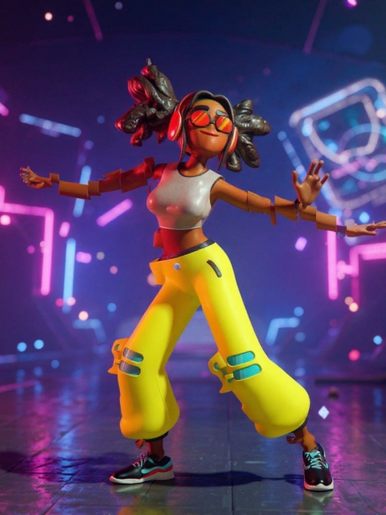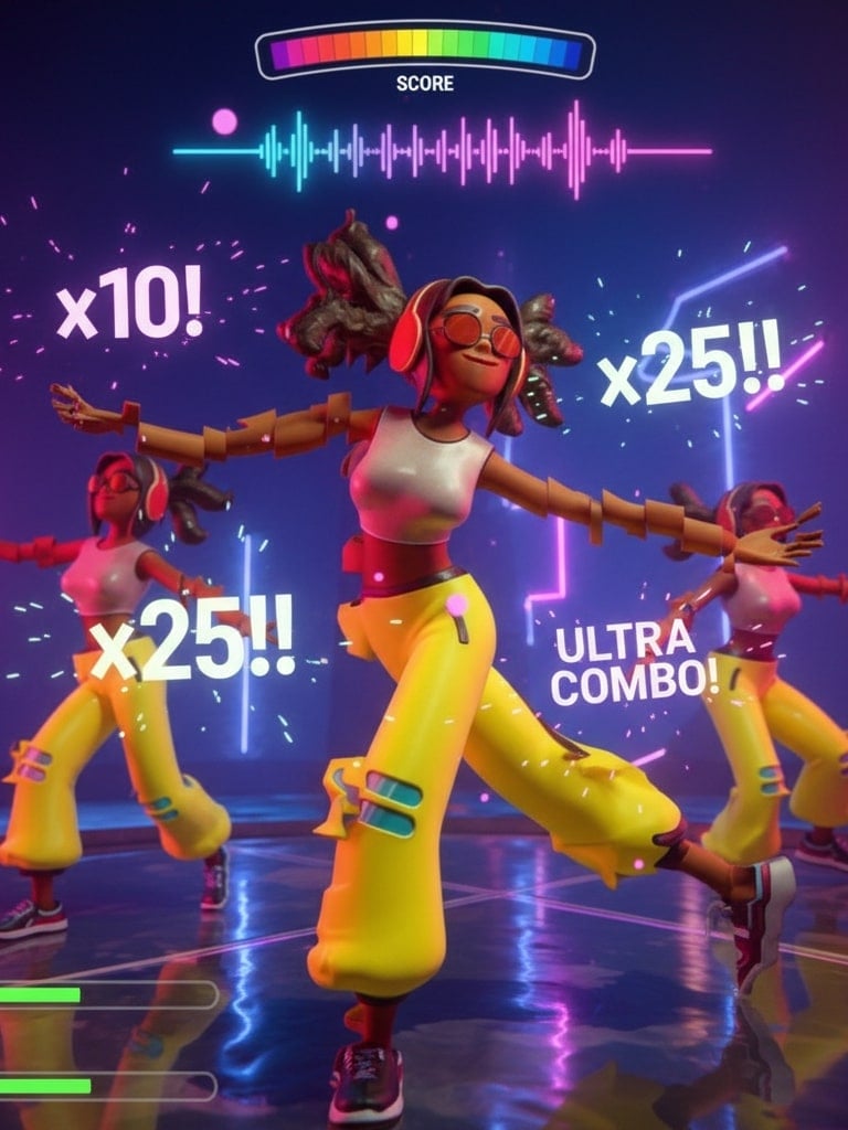 Ένα ζωντανό στιγμιότυπο χορευτικού παιχνιδιού ρυθμού που χαρακτηρίζει τρεις ίδιους 3D κινούμενους χαρακτήρες από τη φωτογραφία αναφοράς, διατηρώντας το μοναδικό κομμωτήριο, τα ακουστικά, τα γυαλιά ηλίου, τα σπορ κίτρινα παντελόνια και το σίγουρο χορό. Βυθισμένος κινηματογραφικός φωτισμός με ροζ και μοβ λάμψη, γυαλιστερό αντανακλαστικό πάτωμα που λάμπει κάτω από προβολείς, δυναμικό 3D στυλ κινουμένων σχεδίων. Διασύνδεση παιχνιδιού ρυθμού με εντυπωσιακό UI: Μετρητής βαθμολογίας στην κορυφή, πολύχρωμα κινούμενα σχέδια κυματομορφής μουσικής που συγχρονίζονται με το ρυθμό, η αντίστροφη μέτρηση του χρονοδιακόπτη και οι πλωτοί αριθμοί combo. Εξαιρετικά λεπτομερή ατμόσφαιρα που μοιάζει με παιχνίδι με ενεργειακές ράβδους, εφέ σωματιδίων νέον και εμβολιασμό arcade ρυθμού HUD Elements. Εξαιρετικά λεπτομέρειες, κινηματογραφικά, βυθιστικά, τρισδιάστατα κινούμενα σχέδια.