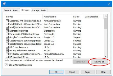 Βήμα 2.Ελέγξτε το πλαίσιο Απόκρυψης όλων των υπηρεσιών της Microsoft και επιλέξτε το κουμπί Απενεργοποίησης όλων.