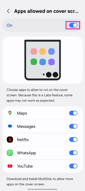 Η Samsung προσφέρει μια εγγενή επιλογή για την εκτέλεση εφαρμογών στην οθόνη κάλυψης του Flip. Ωστόσο, είναι λίγο δύσκολο να βρεθεί, δεδομένου ότι είναι κρυμμένο στην ενότητα "Labs" σε προχωρημένες ρυθμίσεις. Μόλις ενεργοποιήσετε αυτήν τη λειτουργία, μπορείτε να έχετε πρόσβαση σε μια χούφτα εφαρμογών στην οθόνη εξώφυλλου. Αυτές περιλαμβάνουν χάρτες, μηνύματα, Netflix, WhatsApp, YouTube και πολλά άλλα.