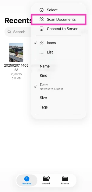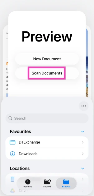 Ο σαρωτής εγγράφων ενσωματώνεται σε διάφορες εγγενείς εφαρμογές iPhone. Η νέα εφαρμογή "Προεπισκόπηση", που παρουσιάστηκεiOS 26, έχει σχεδιαστεί για τον ειδικό σκοπό της σχολιασμού και της επεξεργασίας PDFs. Είναι επίσης ικανό να σαρώνει ψηφιακά έγγραφα από φυσικά αντίγραφα. Εάν θέλετε να εργαστείτε με κάτι πιο οικείο, η εφαρμογή αρχείων έχει ενσωματωμένο σαρωτή σε αυτό επίσης. Η διαδικασία σάρωσης απαιτεί να δείχνει την κάμερα σε μια σελίδα και το iPhone κάνει τα υπόλοιπα.