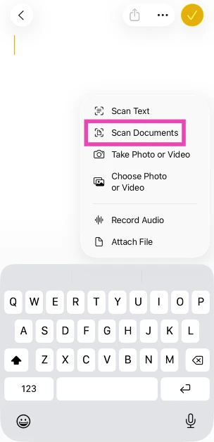 Αυτές οι μέθοδοι δημιουργούν αυτόνομα ψηφιακά αρχεία από φυσικά έγγραφα. Εάν θέλετε να σαρώσετε μια σελίδα από ένα βιβλίο και να το τοποθετήσετε ως αναφορά σε μια σημείωση, το iPhone σας προσφέρει αυτή την επιλογή επίσης. Μόλις βρίσκεστε στοΣΗΜΕΙΩΣΗ, μπορείτε να σαρώσετε ένα έγγραφο και να το προσθέσετε σε οποιαδήποτε σημείωση χρησιμοποιώντας το μενού Συνημμένων.