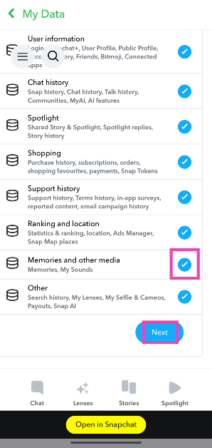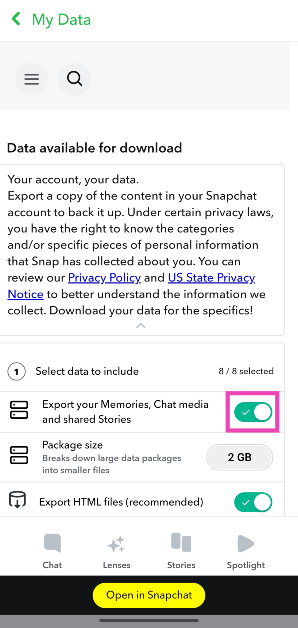 Βήμα 4:Ενεργοποιήστε το διακόπτη εναλλαγής δίπλα στοΕξαγάγετε τις αναμνήσεις σας, τα μέσα συνομιλίας και τις κοινές ιστορίες σας. Εάν δεν θέλετε να εξαγάγετε άλλα αντικείμενα, απενεργοποιήστε τους διακόπτες εναλλαγής τους.