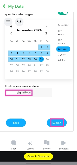 Οι διαγραμμένες αναμνήσεις Snapchat δεν μπορούν να αποκατασταθούν, αλλά μπορείτε να ζητήσετε από το Snapchat ένα αντίγραφο του αντιγράφου ασφαλείας. ΠηγαίνωΠροφίλ> Ρυθμίσεις> Τα δεδομένα μου, επιλέξτεΑναμνήσεις, μέσα συνομιλίας και κοινόχρηστες ιστορίες> Αναμνήσεις και άλλα μέσα ενημέρωσης, Εισαγάγετε το εύρος χρόνου και δώστε την εφαρμογή με τη διεύθυνση email σας. Τα δεδομένα Snapchat Memories θα σας αποσταλούν μέσω ηλεκτρονικού ταχυδρομείου μετά από λίγο.