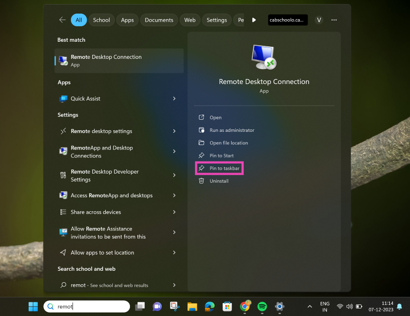 Πληκτρολογήστε τη σύνδεση απομακρυσμένης επιφάνειας εργασίας στο πλαίσιο αναζήτησης της γραμμής εργασιών και επιλέξτε 'PIN to TaskBar' από τις επιλογές εφαρμογής.