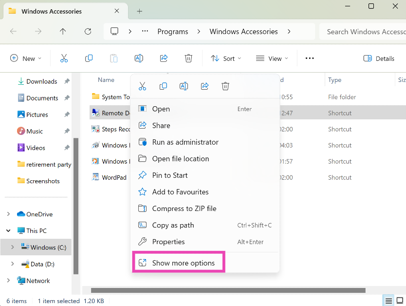 Βήμα 3: Κάντε δεξί κλικσε απομακρυσμένη σύνδεση επιφάνειας εργασίας και επιλέξτεΕμφάνιση περισσότερες επιλογές.