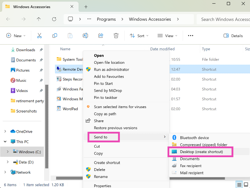 Μπορείτε να δημιουργήσετε έναΚάντε δεξί κλικ στο εικονίδιο της στη θέση του αρχείου και επιλέγονταςΕμφάνιση περισσότερων επιλογών> Αποστολή στο> επιφάνεια εργασίας. Εναλλακτικά, μπορείτε επίσης να κάνετε δεξί κλικ στην ίδια την επιφάνεια εργασίας και επιλέξτεΝέα> συντόμευση. Στο παρακάτω παράθυρο, εισαγάγετε τη θέση αρχείου του RDC και πατήστεΕπόμενος.