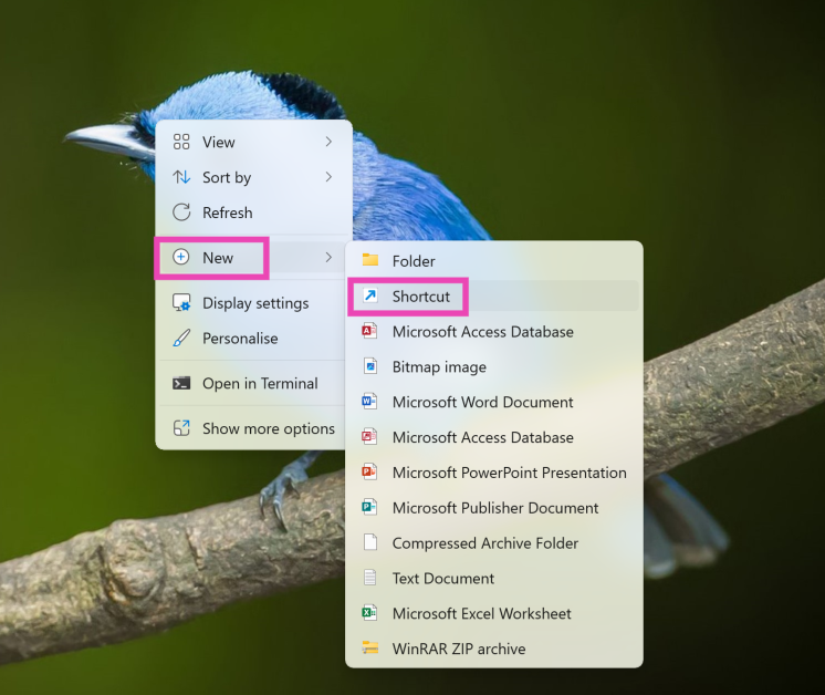Βήμα 1: Κάντε δεξί κλικοπουδήποτε στην επιφάνεια εργασίας και επιλέξτεΝέα> συντόμευση.
