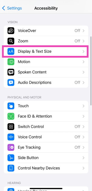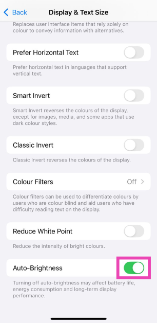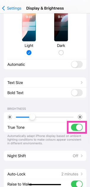 ΠηγαίνωΡυθμίσεις> Προσβασιμότητα> Εμφάνιση και μέγεθος κειμένουΚαι απενεργοποιήστε το διακόπτη εναλλαγής δίπλα στην αυτόματη φωτεινότητα. Απενεργοποιήστε τις ρυθμίσεις "ΕΝΗΜΕΡΩΣΗ ΕΝΕΡΓΟΠΟΙΗΣΗ" και ΡΥΘΜΙΣΕΙΣ Προσοχής στη σελίδα προσβασιμότητας. Τέλος, απενεργοποιήστε τον πραγματικό τόνο και το νυχτερινό θέαμα από τις ρυθμίσεις της οθόνης.