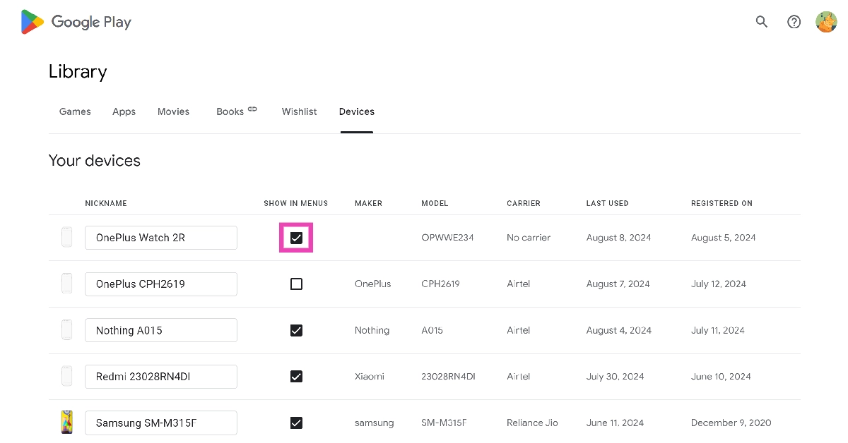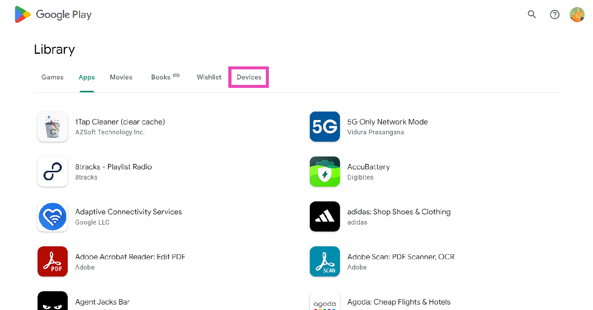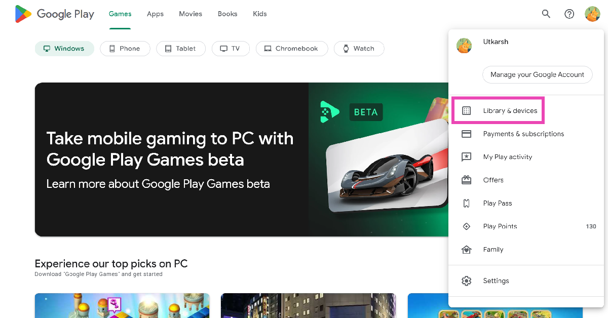 Βήμα 2:Κάντε κλικ στο δικό σαςεικόνα προφίλστην επάνω δεξιά γωνία της οθόνης και επιλέξτεΒιβλιοθήκη και συσκευές.