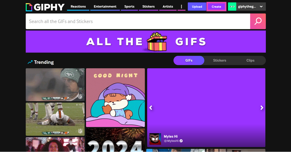 Βήμα 1:Ξεκινήστε το πρόγραμμα περιήγησης στο Web στον υπολογιστή σας και μεταβείτεhttps://giphy.com/. Συνδεθείτε στον λογαριασμό σας. Εάν δεν έχετε, δημιουργήστε έναν λογαριασμό.
