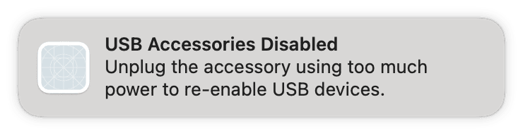 Το μήνυμα σφάλματος σημαίνει ότι το MACOS σας εμποδίζει να χρησιμοποιήσετε συσκευές USB που συνδέονται με το Mac σας. Στην περίπτωση του μηνύματος σφάλματος που περιγράφηκε παραπάνω, αυτό οφείλεται στο γεγονός ότι μία ή περισσότερες συσκευές αντλούν υπερβολική ισχύ από το Mac σας. Υπάρχουν δύο τύποι συσκευών USB: εκείνοι που παρέχουν τη δική τους ισχύ και εκείνους που βασίζονται στην ανάληψη ισχύος από το Mac σας μέσω της θύρας USB. Εάν μια συσκευή που τροφοδοτείται με USB προσπαθεί να τραβήξει υπερβολική ισχύ, θα απενεργοποιηθεί.