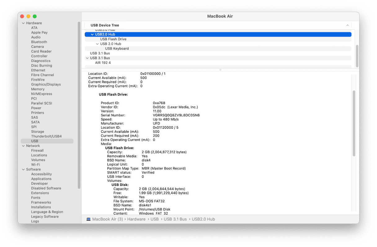 - Στην ενότητα υλικού στην πλαϊνή μπάρα, επιλέξτε USB - θα δείτε τα λεωφορεία USB, ένα για κάθε υποδοχή USB στο Mac σας, που αναφέρεται.