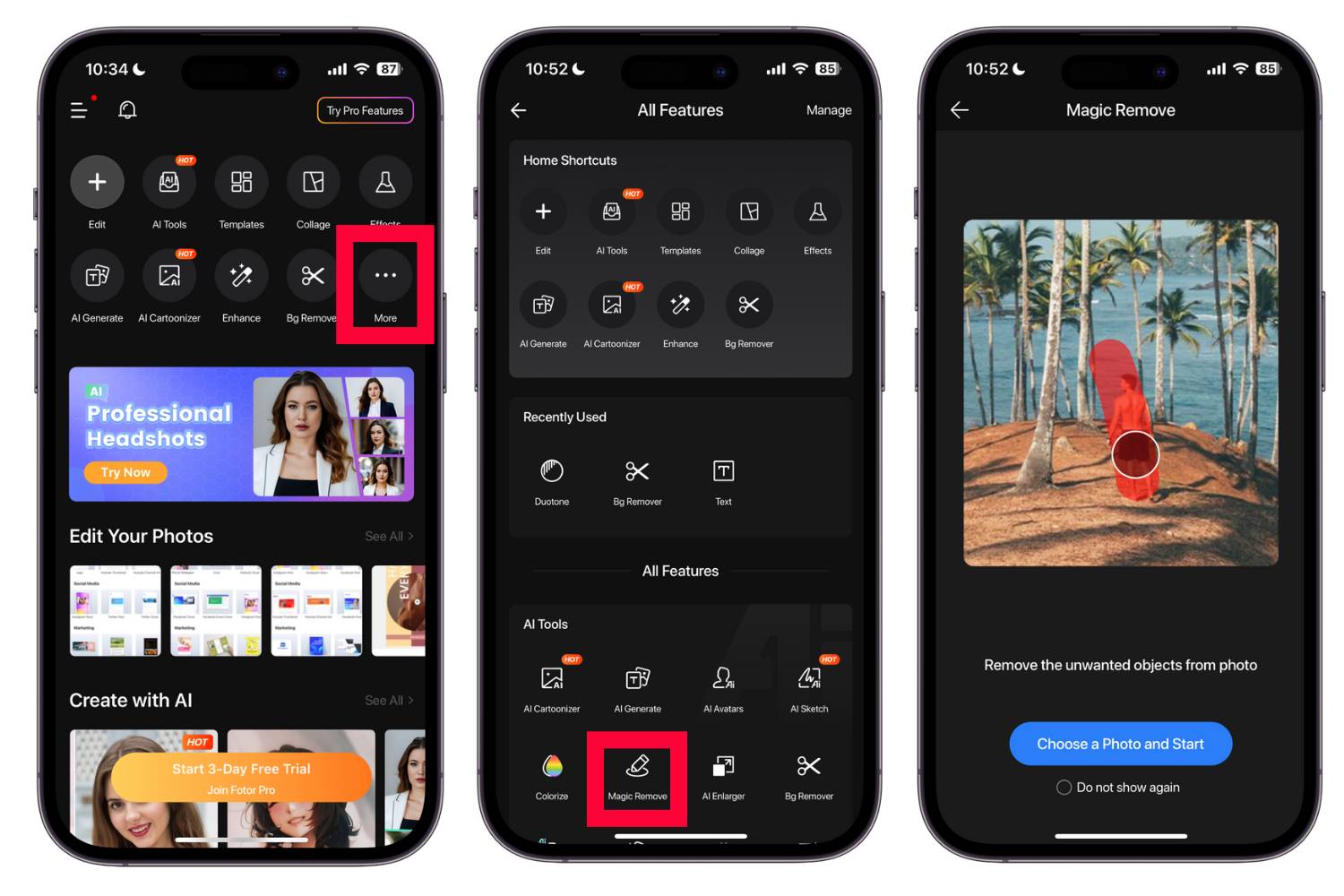 Ανοίξτε την εφαρμογή Fotor, πατήστε "Περισσότερα" και επιλέξτε "Magic Remove". Αφαιρέστε το κείμενο από την εικόνα με το αφαίρεση αντικειμένων του Fotor μέσα σε λίγα δευτερόλεπτα. Είστε ελεύθεροι να καταργήσετε τα ανεπιθύμητα αντικείμενα από τις φωτογραφίες στο διαδίκτυο για να φέρετε μια εκπληκτική ματιά στην εικόνα σας!
