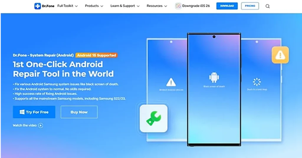 Ένας συνεχής αγώνας με μια αποτυχημένη ενημέρωση Android ή ένα τηλέφωνο που έχει κολλήσει μεσαία επεξεργασία δημιουργεί την ανάγκη για ένα αφοσιωμένο πρόγραμμα επισκευής Dr.Fone-System (Android). ΑυτόΛογισμικό επισκευής AndroidΔιευκολύνει τους χρήστες στον καθορισμό πολυάριθμων ζητημάτων, όπως η μαύρη οθόνη του θανάτου. Το πρόγραμμα εγγυάται ένα υψηλό ποσοστό επιτυχίας για τον καθορισμό των προβλημάτων του Android και αυτό δεν απαιτείται καμία δεξιότητα. Πιο εντυπωσιακά, υποστηρίζει σχεδόν όλα τα βασικά μοντέλα Samsung, συμπεριλαμβανομένου του Samsung S22/24.
