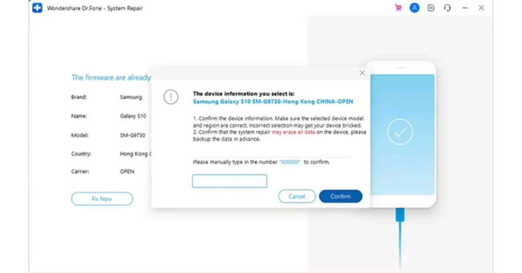 Μόλις κατεβάσετε, προχωρήστε στο κουμπί "Fix Now" και πατήστε το κουμπί "Συνέχεια" μετά την πληκτρολόγηση "000000" στη νέα οθόνη για την επισκευή της συσκευής σας Android.