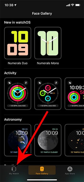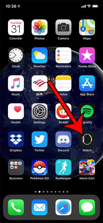 Βήμα 1: Πατήστε το κουμπί Crown στο πλάι του ρολογιού. Σημειώστε ότι αυτό υποθέτει ότι είστε ήδη στην αρχική οθόνη ρολογιών. Εάν όχι, ίσως χρειαστεί να πατήσετε το κουμπί Crown μερικές φορές μέχρι να δείτε την οθόνη με τα εικονίδια της εφαρμογής.