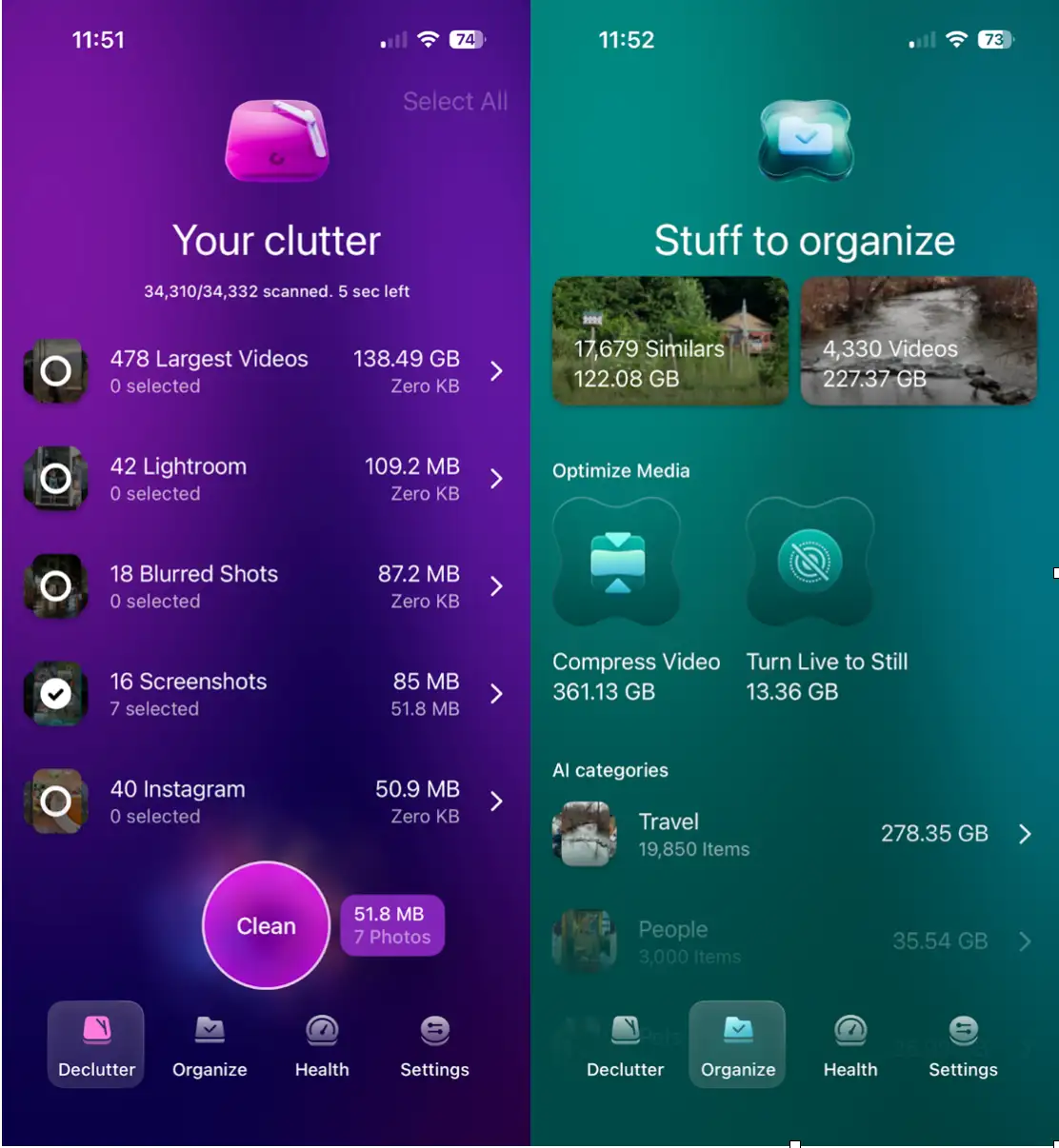 Το Cleaner Kit έχει σχεδιαστεί για να βοηθά τους χρήστες να ανακτήσουν τον έλεγχο του αποθηκευτικού χώρου του iPhone μέσω σάρωσης με τεχνητή νοημοσύνη και έξυπνης ανίχνευσης αρχείων. Μετά την εγκατάσταση της εφαρμογής, εκτελεί μια βαθιά σάρωση της βιβλιοθήκης και του συστήματός σας, εντοπίζοντας διπλότυπες φωτογραφίες, παρόμοιες εικόνες, μεγάλα βίντεο, αχρησιμοποίητες επαφές, ακόμη και παρωχημένα συμβάντα ημερολογίου.