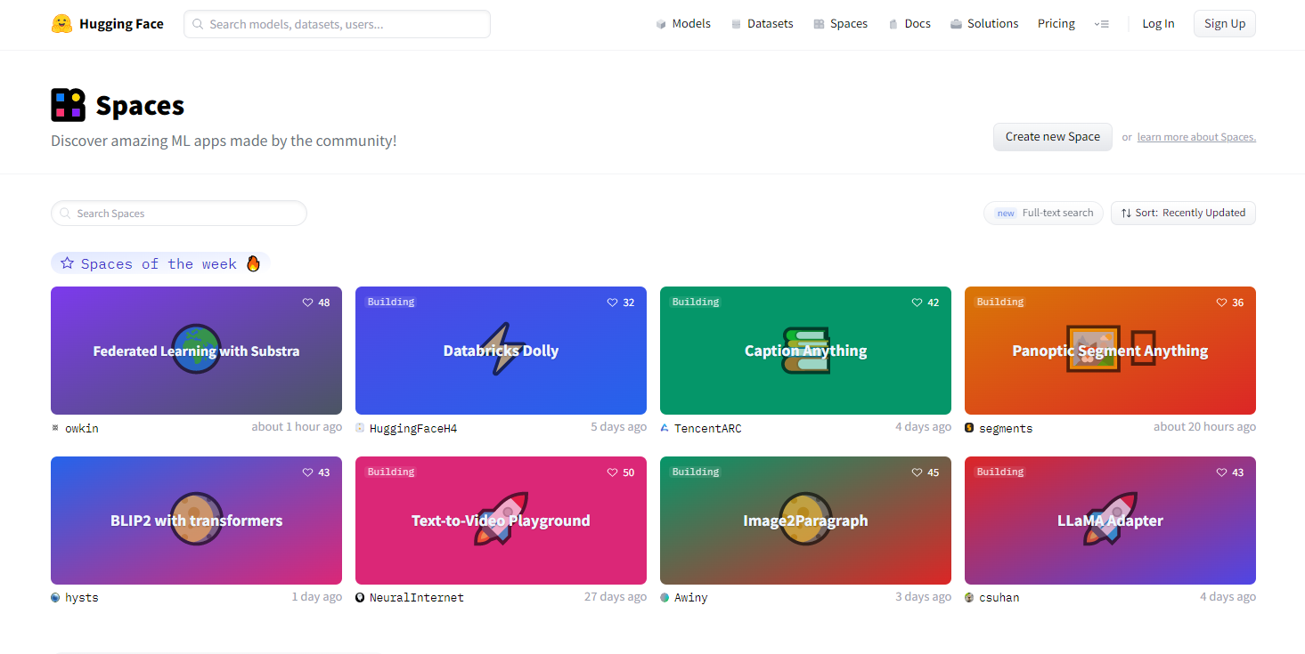 Εκτός από την προώθηση της μάθησης σχετικά με την τεχνολογία AI, η αγκάλιασμα χώρων προσώπου ενθαρρύνει τη συνεργασία, επιτρέποντας σε πολλούς χρήστες να εργάζονται σε έργα και να μοιράζονται αποτελέσματα. Αν και δεν είναι μια συμβατική παιδική χαρά AI, παρουσιάζει εντυπωσιακές εφαρμογές μηχανικής μάθησης που δημιουργούνται από την κοινότητα του Face Hugging και προσφέρει demos διαφόρων μοντέλων ανοιχτού κώδικα, όπως Pixera, Maskcut, Flan Grammar Correction, Aiornot κ.λπ. κ.λπ.