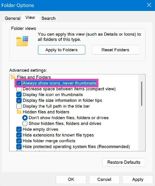 Βήμα 4:Επιλέξτε 'Να εμφανίζονται πάντα εικονίδια, ποτέ μικρογραφίες'.