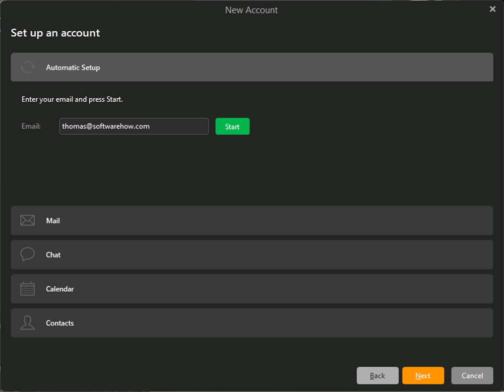 Η διασύνδεση νέων λογαριασμών EM Client. Τις περισσότερες φορές, θα θελήσετε να χρησιμοποιήσετε αυτόματη ρύθμιση.Η αυτόματη λειτουργία εγκατάστασης του πελάτη EM είναι εξίσου απλή, αν και δεν είναι εξορθολογισμένη. Αυτό οφείλεται εν μέρει στο γεγονός ότι σας δίνει περισσότερες επιλογές, όπως η δημιουργία ημερολογίων CalDAV και οι λίστες επαφών CardDAV που δεν συνδέονται απαραιτήτως με τις διευθύνσεις ηλεκτρονικού ταχυδρομείου. Τούτου λεχθέντος, δεν είμαι σίγουρος ποιοι είναι οι πραγματικοί χρήστες του CardDav, αλλά η ύπαρξη επιπλέον επιλογών είναι πάντα καλό.