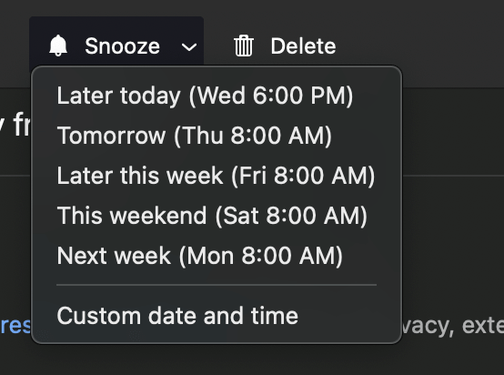 Ο πελάτης EM θα σας βοηθήσει να εργαστείτε γρήγορα μέσω των εισερχομένων σας. Ένα εύχρηστο χαρακτηριστικό είναιΥπνάκος, η οποία απομακρύνει προσωρινά ένα μήνυμα ηλεκτρονικού ταχυδρομείου από τα εισερχόμενά σας μέχρι να έχετε χρόνο να το αντιμετωπίσετε. Από προεπιλογή, αυτό είναι 8:00 π.μ. την επόμενη μέρα, αλλά μπορείτε να προσαρμόσετε την ώρα ή την ημερομηνία.