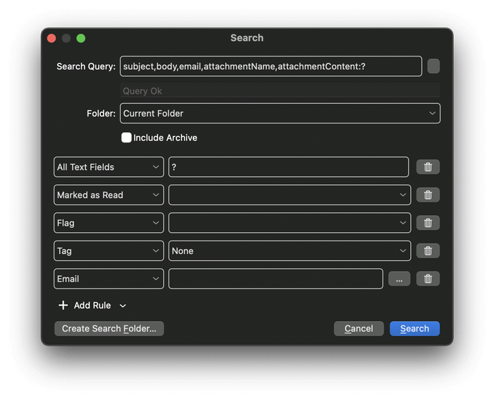 Η αναζήτηση είναι εξίσου ισχυρή. Μια απλή γραμμή αναζήτησης είναι διαθέσιμη στο επάνω μέρος της οθόνης, ενώ μια προηγμένη αναζήτηση μπορεί να προσεγγιστεί από το μενού:Επεξεργασία> Βρείτε> μηνύματα αναζήτησης…Οι κανόνες μπορούν να εκτελεστούν αυτόματα ή χειροκίνητα, σε εισερχόμενα ή εξερχόμενα μηνύματα, ακόμη και σε ολόκληρους φακέλους των υφιστάμενων μηνυμάτων.