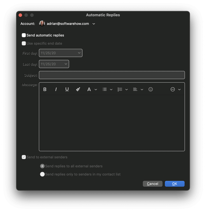 Μπορείτε να επιλέξετε όταν οι απαντήσεις και τα νέα μηνύματα ηλεκτρονικού ταχυδρομείου αποστέλλονται χρησιμοποιώνταςΣτέλνω αργότερα. Απλά επιλέξτε την επιθυμητή ημερομηνία και ώρα από ένα αναδυόμενο παράθυρο.