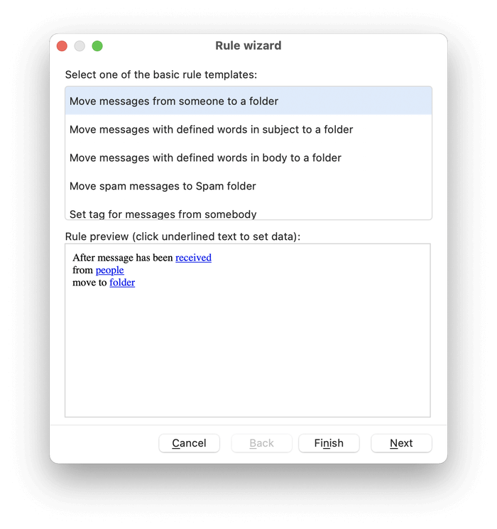 Αυτό ακούγεται σαν πολλή δουλειά. Ευτυχώς, μπορείτε να αυτοματοποιήσετε πολλά από αυτά χρησιμοποιώντας τους κανόνες, ένα από τα πιο ισχυρά χαρακτηριστικά του πελάτη EM. Οι κανόνες σας επιτρέπουν να ελέγχετε πότε πραγματοποιείται μια ενέργεια σε ένα μήνυμα, ξεκινώντας από ένα πρότυπο.