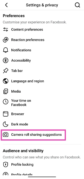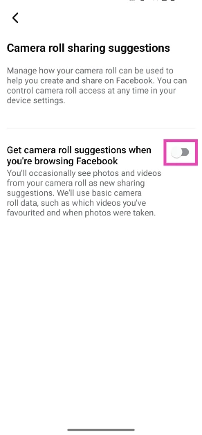 Ξεκινήστε την εφαρμογή Facebook στο τηλέφωνό σας, πατήστε το εικονίδιο μενού και, στη συνέχεια, μεταβείτε στοΡυθμίσεις και Προστασία Προσωπικών Δεδομένων> Ρυθμίσεις> Προτάσεις κοινής χρήσης κυλίνδρων κάμεραςΚαι απενεργοποιήστε το διακόπτη εναλλαγής δίπλα στο 'Get Camera Roll προτάσεις όταν περιηγείστε στο Facebook'.