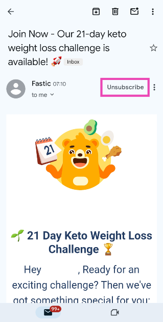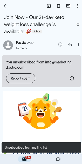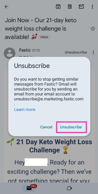 Πατώντας στο κουμπί unsubscribe μπορεί να κάνει δύο πράγματα. Θα μεταφερθείτε είτε στον ιστότοπο/εφαρμογή του αποστολέα για να ολοκληρώσετε τη διαδικασία είτε το Gmail θα σας μεταφέρει από τη λίστα αλληλογραφίας χωρίς να αφήσετε την εφαρμογή. Το τελευταίο εργάζεται για υπηρεσίες που απαιτούν ένα αίτημα ηλεκτρονικού ταχυδρομείου για την αποστολή εγγραφής από τις ενημερώσεις τους. Το Gmail συνθέτει αυτόματα και στέλνει αυτό το μήνυμα ηλεκτρονικού ταχυδρομείου για λογαριασμό σας.