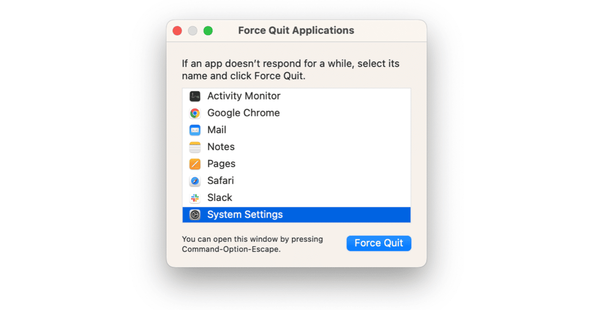 - Πατήστε Command + Option + Escape, επιλέξτε Ρυθμίσεις συστήματος στο παράθυρο και κάντε κλικ στην επιλογή Force Quit.