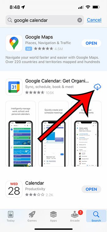 Μπορείτε να πάρετε την εφαρμογή Google Calendar στην κινητή συσκευή σας iPhone πηγαίνοντας στο App Store, επιλέγοντας την καρτέλα Αναζήτηση στο κάτω μέρος της οθόνης, αναζητώντας το "Ημερολόγιο Google" και επιλέγοντας το αποτέλεσμα αναζήτησης και, στη συνέχεια, την εγκατάσταση της εφαρμογής.
