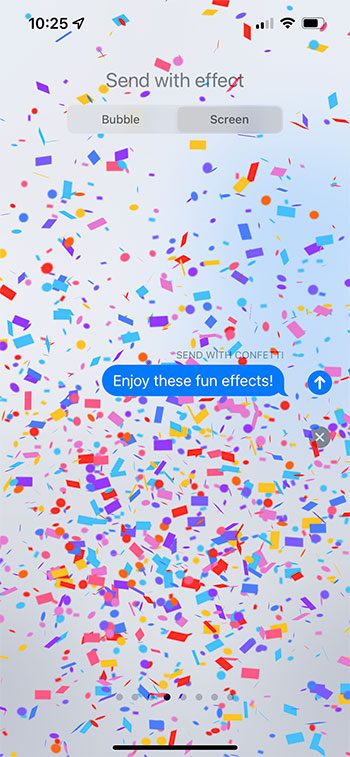 - Στείλτε με το Confetti - παρόμοιο με το αποτέλεσμα που βλέπετε όταν στέλνετε τη λέξη "Συγχαρητήρια", εκτός από το ότι μπορείτε να το εφαρμόσετε σε οτιδήποτε. Βασικά, τα κομφετί βρέχει από την κορυφή της οθόνης.